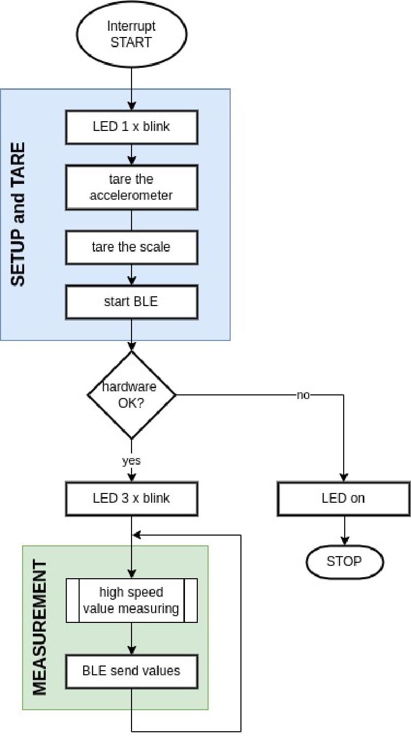 Un LED permette di capire se il dispositivo è funzionante e pronto a misurare. Quando si alimenta il circuito si accende brevemente e poi viene eseguita la parte di programma dedicata alla taratura. Vi consiglio di posizionare in verticale la scopa e appoggiarla al muro e poi accenderla, così si può eseguire al meglio la taratura. Se tutto funziona correttamente allora il LED si accede e si spegne per tre volte e si può collegare il dispositivo di visualizzazione dati con il BLE. Se qualcosa da errore nella fase di taratura allora il LED rimane acceso e il programma si ferma.